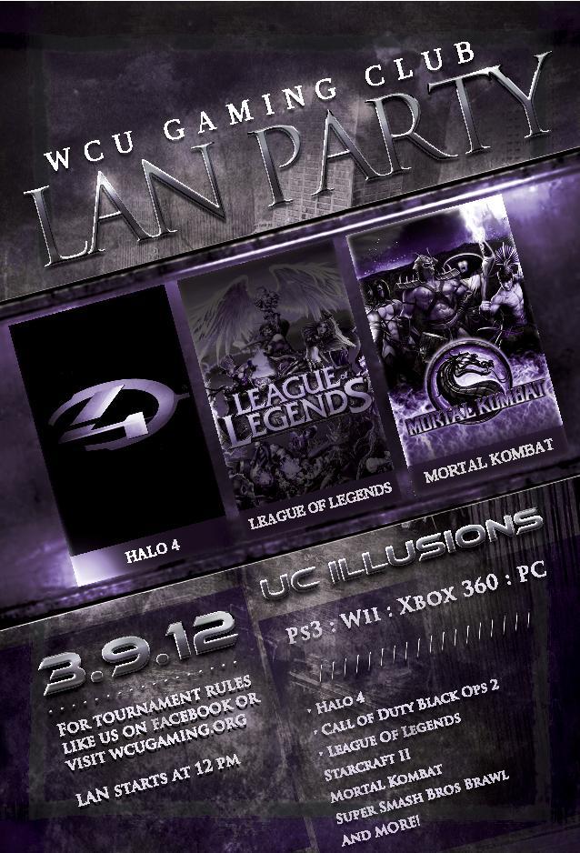 Dustin Posted February 19, 2013 Report Posted February 19, 2013 A Lan Event is where a large group of people get together in intense gaming. The overall idea is to have fun playing games while getting to know your community. This Lan Event consists of Console and PC game tournaments. The event will be hosted in the Illusions room of the University Center at Western Carolina University on March 9th 2013 at 2pm-12am. Anyone is welcome to come out and play for free. However, tournaments have a fee of 5$ and if you are entering the first tournament you need to get their a bit early for you to setup. The prizes vary from games, gift cards, novelty and collective items. The games being played at this Lan Event are:League of Legends 2:00pmSmash Bros 2:15pmHalo 4 4:00pmDinner------------------------------------------Dinner 5:00pmCOD Black Ops2 7:00pm Battlefield 3 7:15pmPlaystation Allstars 7:30pmMario Kart 8:00pmStarcraft 2 8:15pmTeam Fortress 2 9:15pm Quote